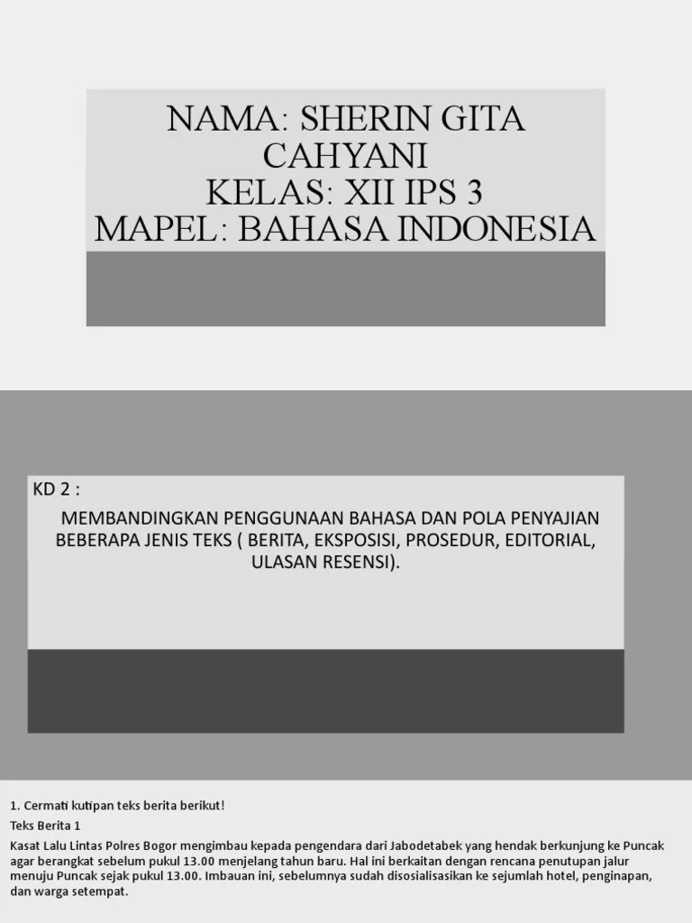 Bentuk bentuk iklan tersebut tentu saja memiliki karakteristik masing masing dalam pola penyajiannya. Membaca non sastra siswa dapat. membandingkan penggunaan bahasa dan pola penyajian beberapa jenis teks (berita, eksposisi, prosedur, editorial, ulasan/resensi) mengomentari isi teks memperlihatkan bukti suatu final Perbedaan antarteks dapat dilihat dari dua aspek yaitu dari segi fitur bahasa dan segi struktur atau pola penyajian. Perbedaan peggunaan bahasa kedua teks tersebut adalah.
